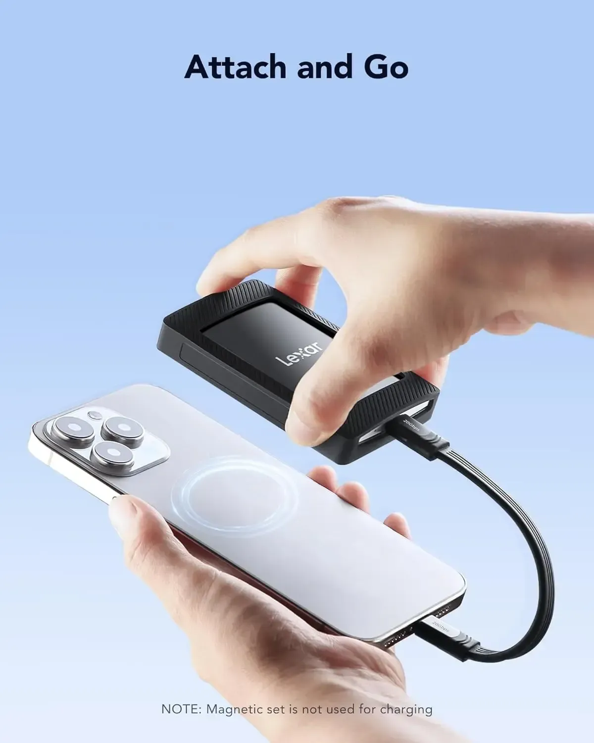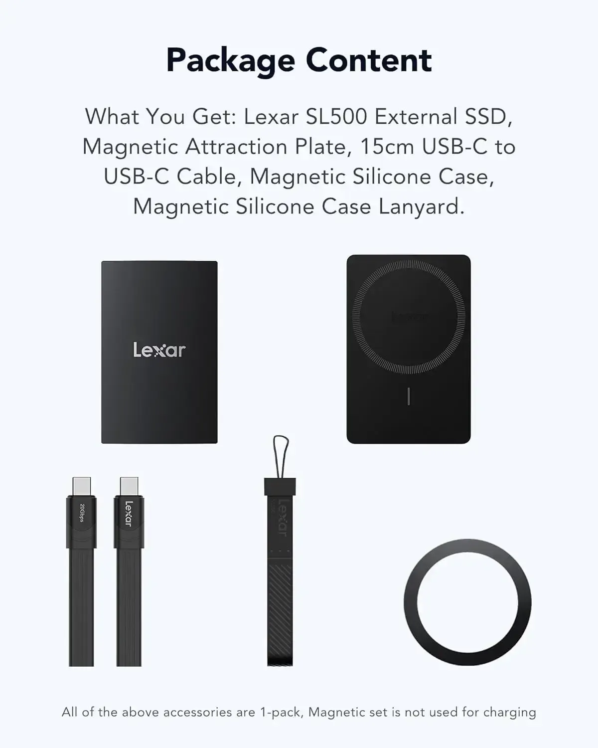 Накопитель Lexar SL500 Portable SSD Magnetic Set USB 3.2 Gen 2x2 2TB, R/W 2000/1800 МБ/с включает в комплект, помимо кабеля 15 см USB Type-C — Type-C, защитный чехол с магнитным креплением типа MagSafe, металлическое кольцо с клеевой основой и запястный ремешок. Кроме защиты накопителя, чехол обеспечивает надежное крепление к смартфонам, оснащенным встроенным магнитным держателем, таким как iPhone. Это, наряду с поддержкой прямой записи видеопотока в формате Apple ProRes 4K 60 FPS, делает Lexar SL500 Portable SSD идеальным решением для съемки высококачественного видео на iPhone 15 Pro, iPhone 15 Pro Max и более новых моделях. Дополнительное кольцо обеспечивает совместимость крепления чехла с широким кругом других устройств.