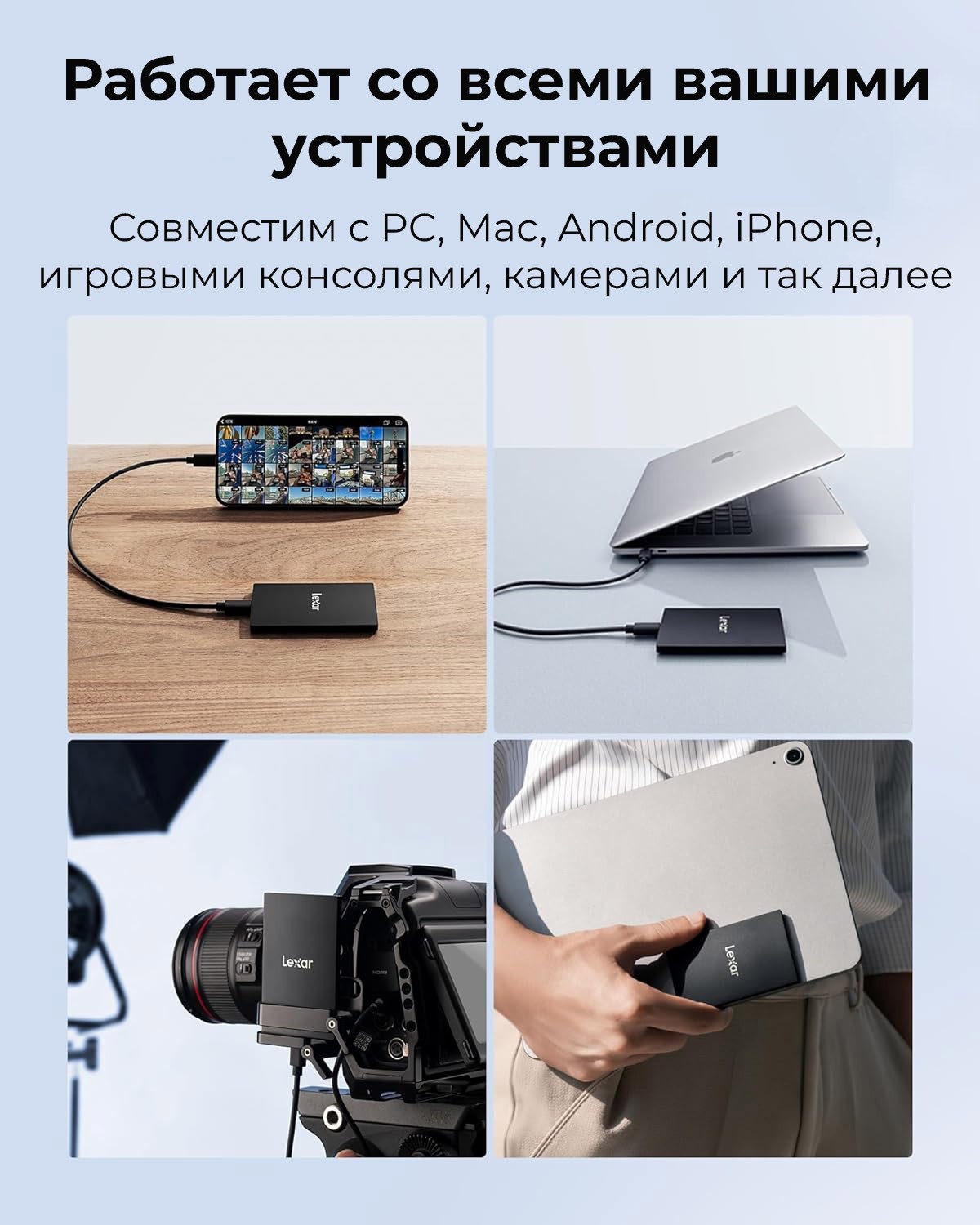 Портативный твердотельный накопитель Lexar® SL500 совместим с ПК, Mac, устройствами Android, iPhone 15 серии, игровыми консолями, камерами и многим другим.