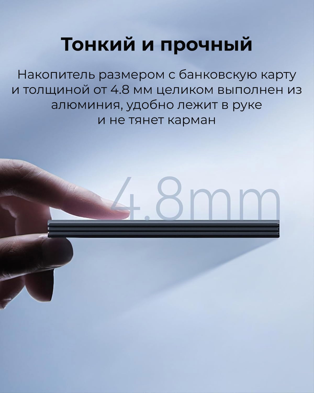 Размером примерно с кредитную карту и толщиной 4,8 мм, тонкая цельная алюминиевая конструкция удобно помещается в ладони или кармане.