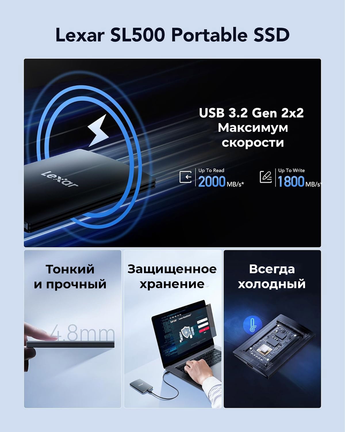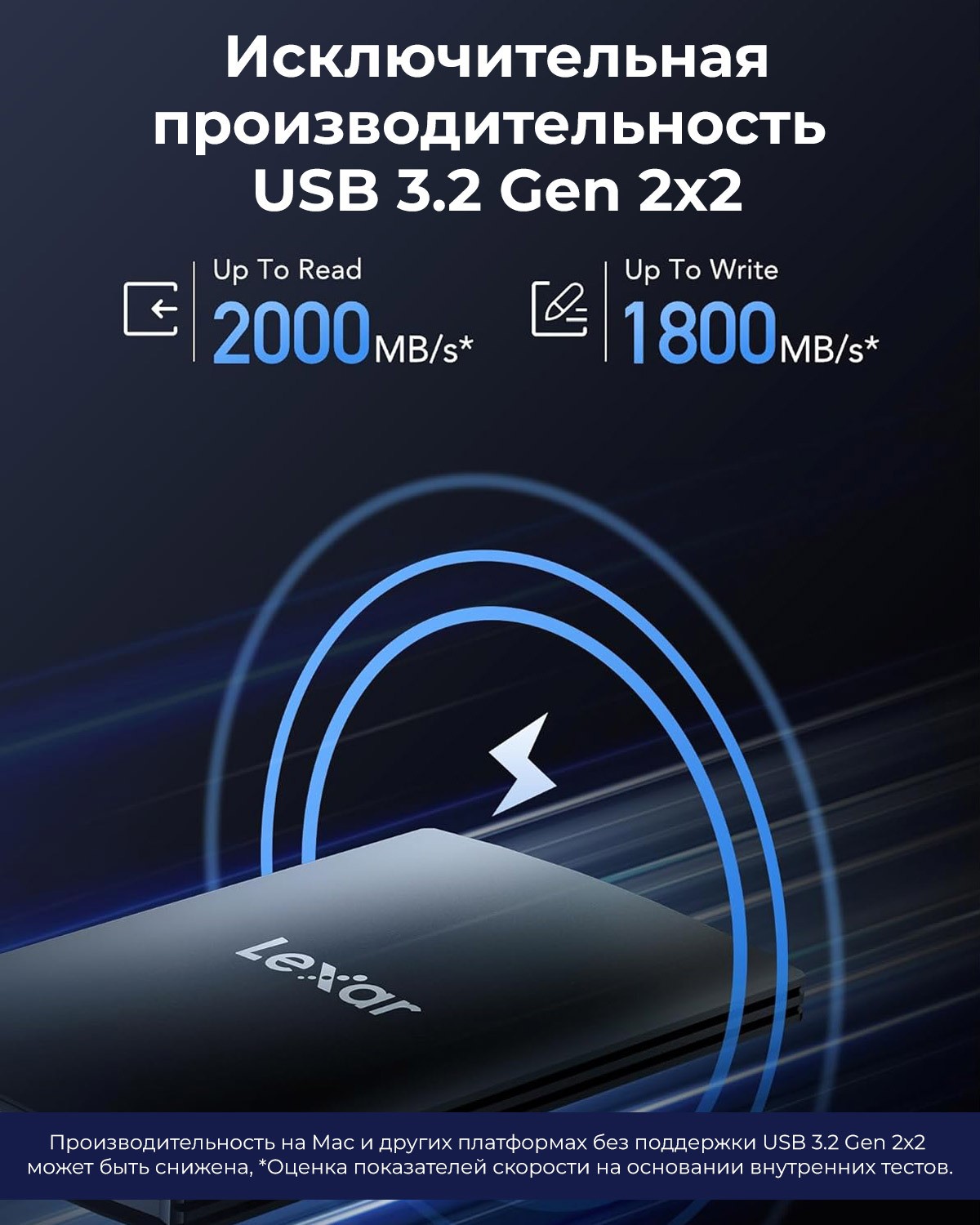 Невероятно высокая скорость чтения до 2000 Мбит / с и записи до 1800 Мбит / с1 ускоряет передачу данных для более эффективной работы (производительность на Mac и других системах, не поддерживающих USB 3.2 Gen 2x2, может быть ниже).