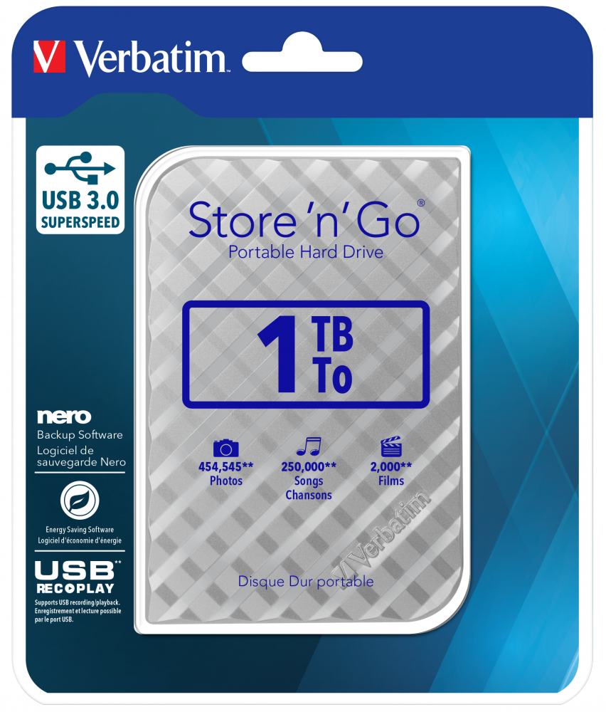 Переносной жесткий диск Verbatim Store 'n' Go — это высокопроизводительное устройство для хранения данных, которое поддерживает сверхбыстрый интерфейс USB 3.0. Этот интерфейс может работать в 10 раз быстрее, чем USB 2.0 (в зависимости от скорости USB-шины), благодаря чему данные передаются практически мгновенно. Храните и переносите файлы с помощью по-настоящему мобильного устройства. Стильный дизайн корпуса прекрасно подойдет к современному рабочему столу и будет отлично сочетаться с ноутбуком. Переносной жесткий диск Store 'n' Go оснащен одним портом USB 3.0, однако совместим с портами USB 2.0, которыми могут быть оборудованы настольные компьютеры и ноутбуки. При этом он не требует внешнего источника питания. Просто подключите жесткий диск к компьютеру, и он сразу будет готов к работе.