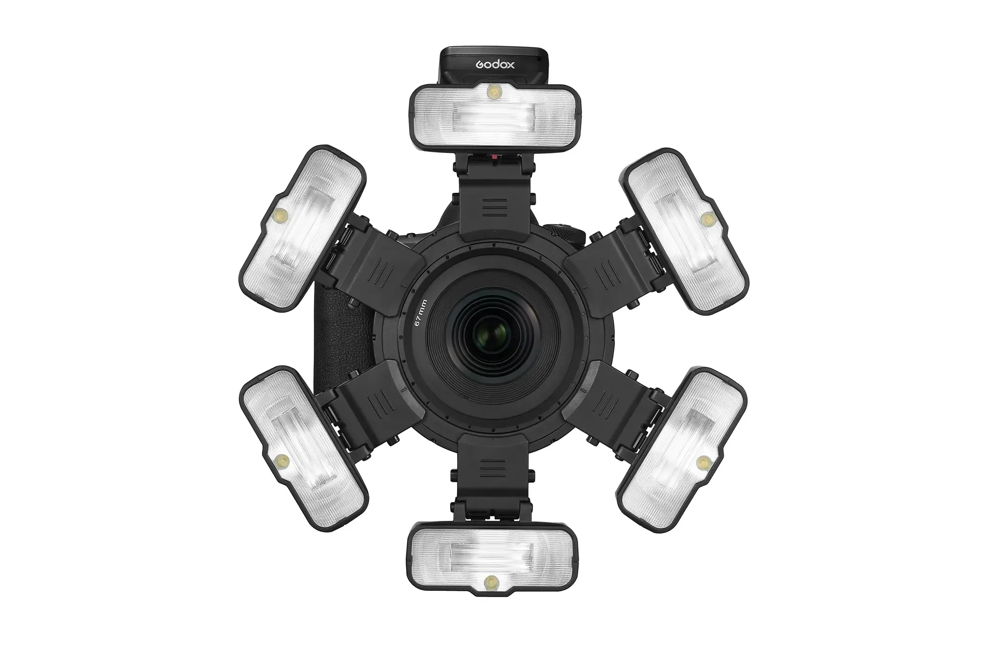 Кроме того, одну или несколько вспышек можно закрепить непосредственно на объективе с помощью дополнительно приобретаемого монтажного кольца Godox MF-R.