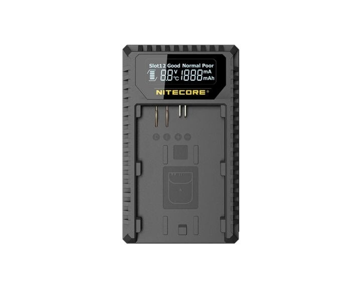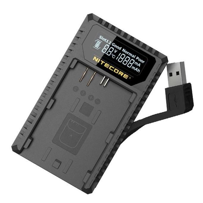 UCN1 рассчитано на одновременную зарядку 2-х аккумуляторов, что как нельзя кстати подходит для любителей и профессиональных фотографов, делающих много фотографий. LED-дисплея над слотами позволяет контролировать абсолютно весь процесс зарядки аккумулятора: показывает кол-во установленных аккумуляторов, уровни заряда каждого из них (графически и в процентах), емкость. Также имеется индикатор, отображающий общее состояние аккумулятора, по которому Вы всегда вовремя сможете понять, что срок службы элемента питания подошел к концу. В сравнении с оригинальной зарядкой Canonзарядное устройство Nitecore UCN1 обладает меньшими габаритами и значительно облегченным весом. Во внутреннем отсеке UCN1 скрыт кабель USB, который служит для подключения к источнику питания. Вы с легкость сможете зарядить разряженную батарею в любое время и любом месте даже при наличии таких внешних источников питания как: Powerbank, солнечная панель, зарядная станция, автомобильный адаптер, ноутбук и т. д.