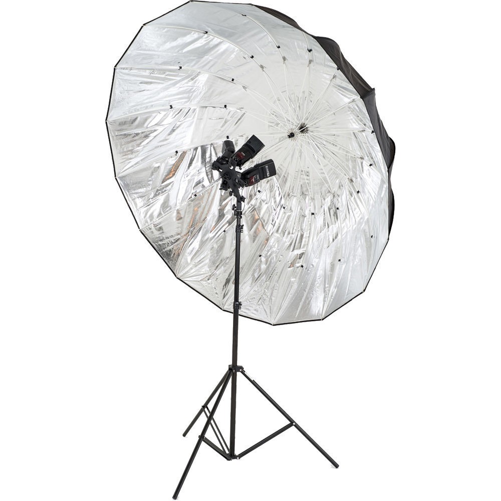 Комплект Mega Umbrella включает одну белую основу зонта, белое покрытие на просвет и серебристое на отражение. Mega Umbrella - наш самый большой зонт со съемным покрытием. Доступно 2 модели: первая - белый полупрозрачный зонт на просвет, который образовывает неглубокую параболическую форму для максимального распространения света; и вторая - зонт с серебристой отражающей поверхностью, который образовывает более глубокую параболическую форму для более сфокусированного распространения света. Каждый зонт оснащен белой основой из стекловолокна и стержнем 8 мм в диаметре.
